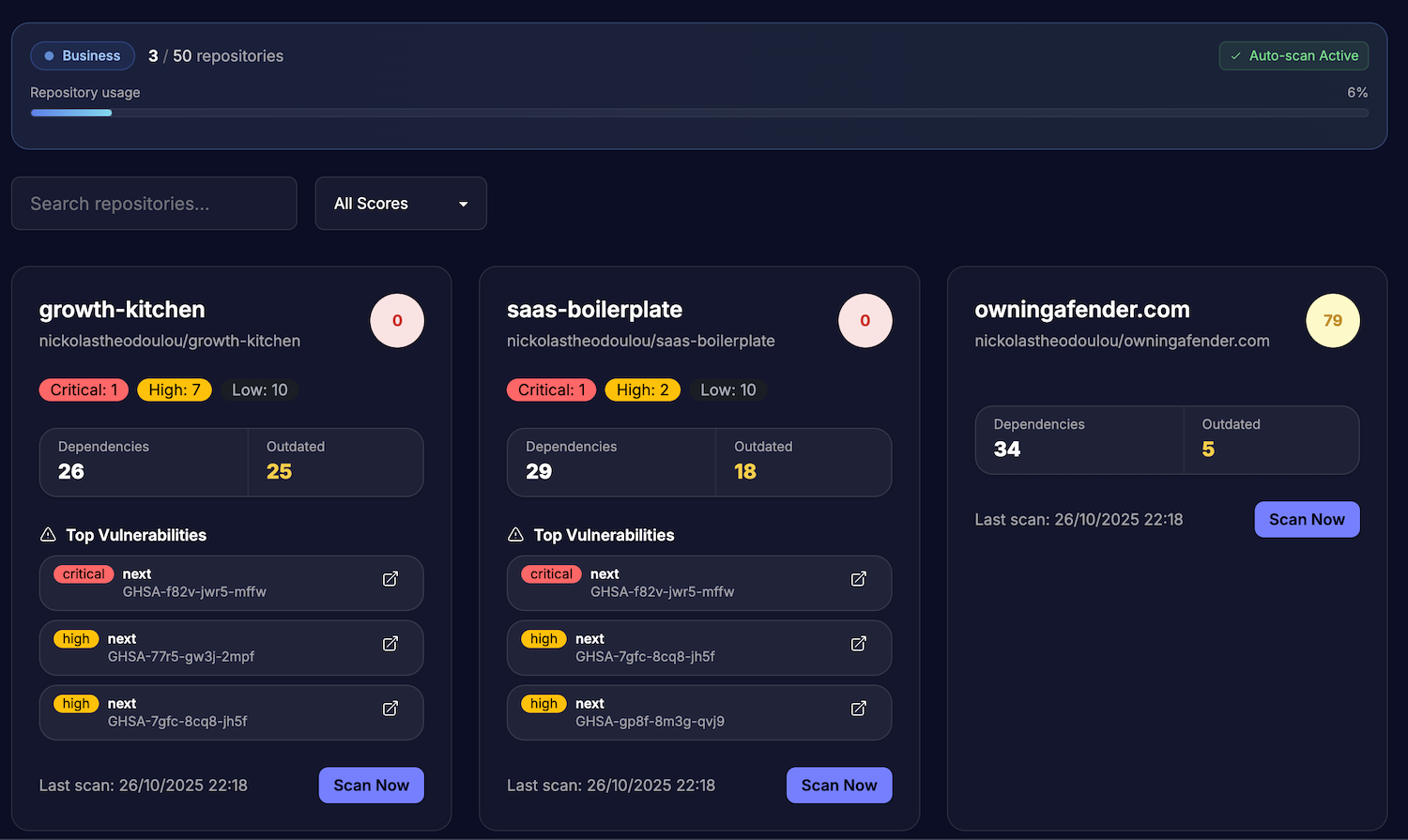 We analyze your npm dependencies daily for vulnerabilities using OSV.dev and calculate health scores for each repository.